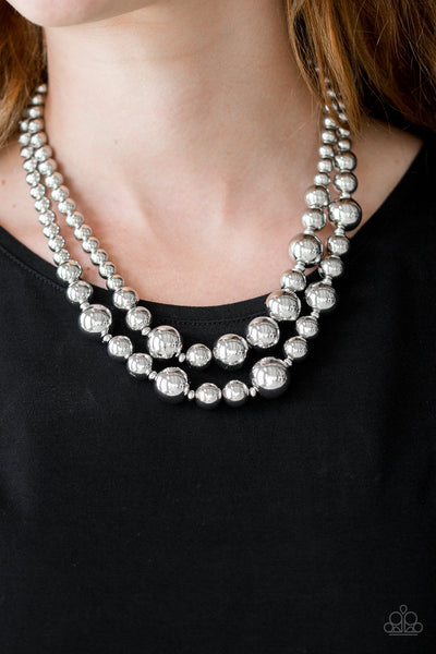 Gradually increasing in size near the center, strands of glistening silver beads are threaded along invisible wires below the collar for a daring look. Features an adjustable clasp closure.